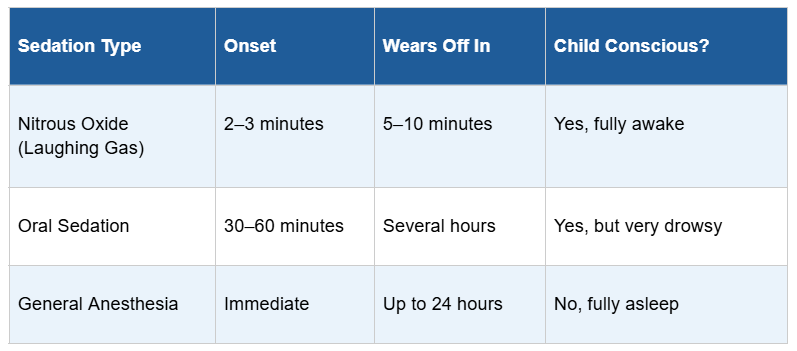 A: They are very different. With nitrous oxide, your child stays fully awake, and the gas wears off within minutes. With general anesthesia, the child is completely unconscious, and recovery can take up to 24 hours. General anesthesia is typically reserved for more complex surgical procedures or children who cannot cooperate even with other forms of sedation.